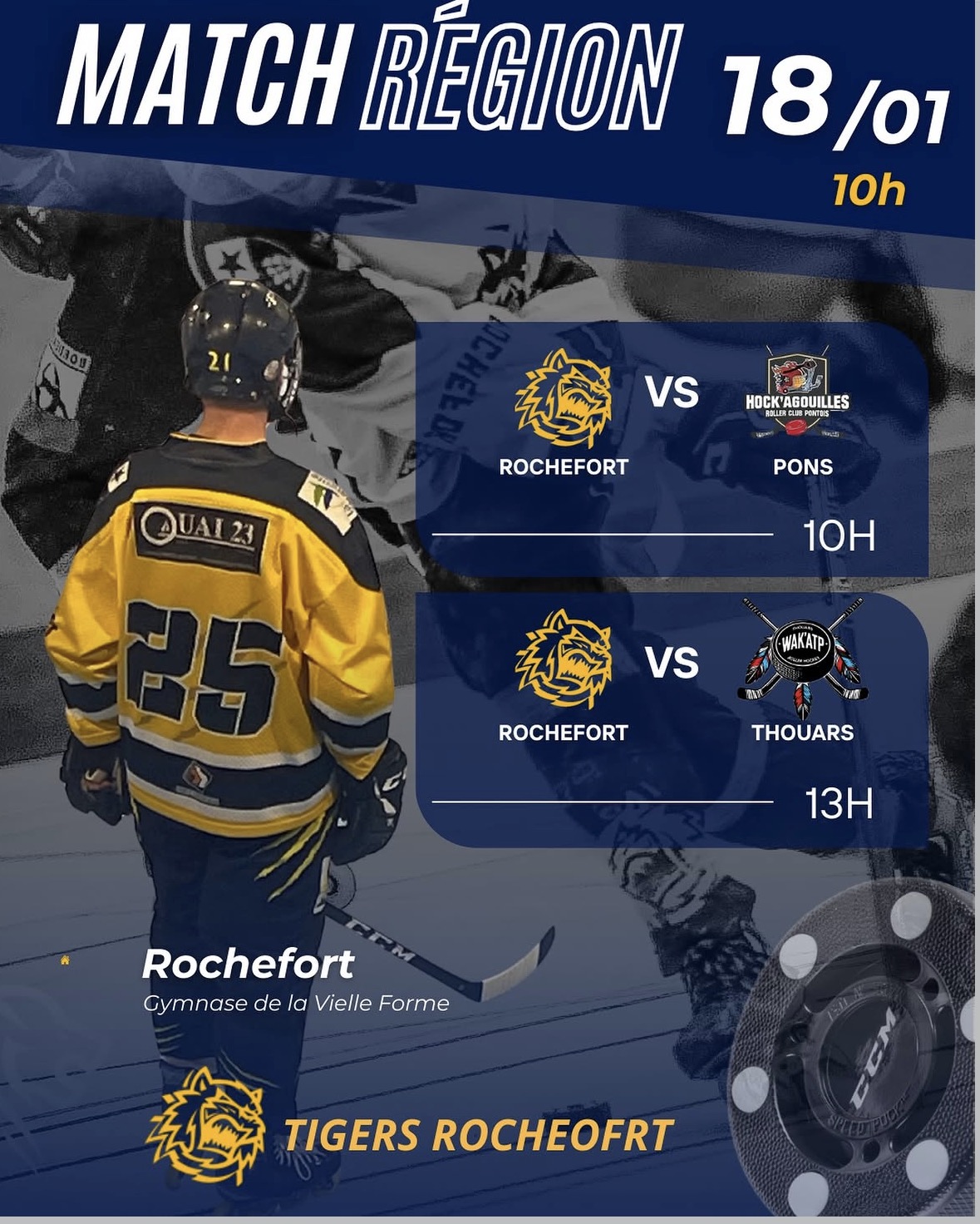 Ce samedi 18 janvier, les Tigers de Rochefort enfilent leurs habits de compétition régionale ! La Rotonde accueille deux rencontres face à Pons (les Hock’agouilles) et Thouars. Un double programme à domicile qui s’annonce animé. Les Tigers vont tout donner devant leur public, alors venez les encourager ! Deux matchs, deux opportunités de briller. En avant Rochefort !