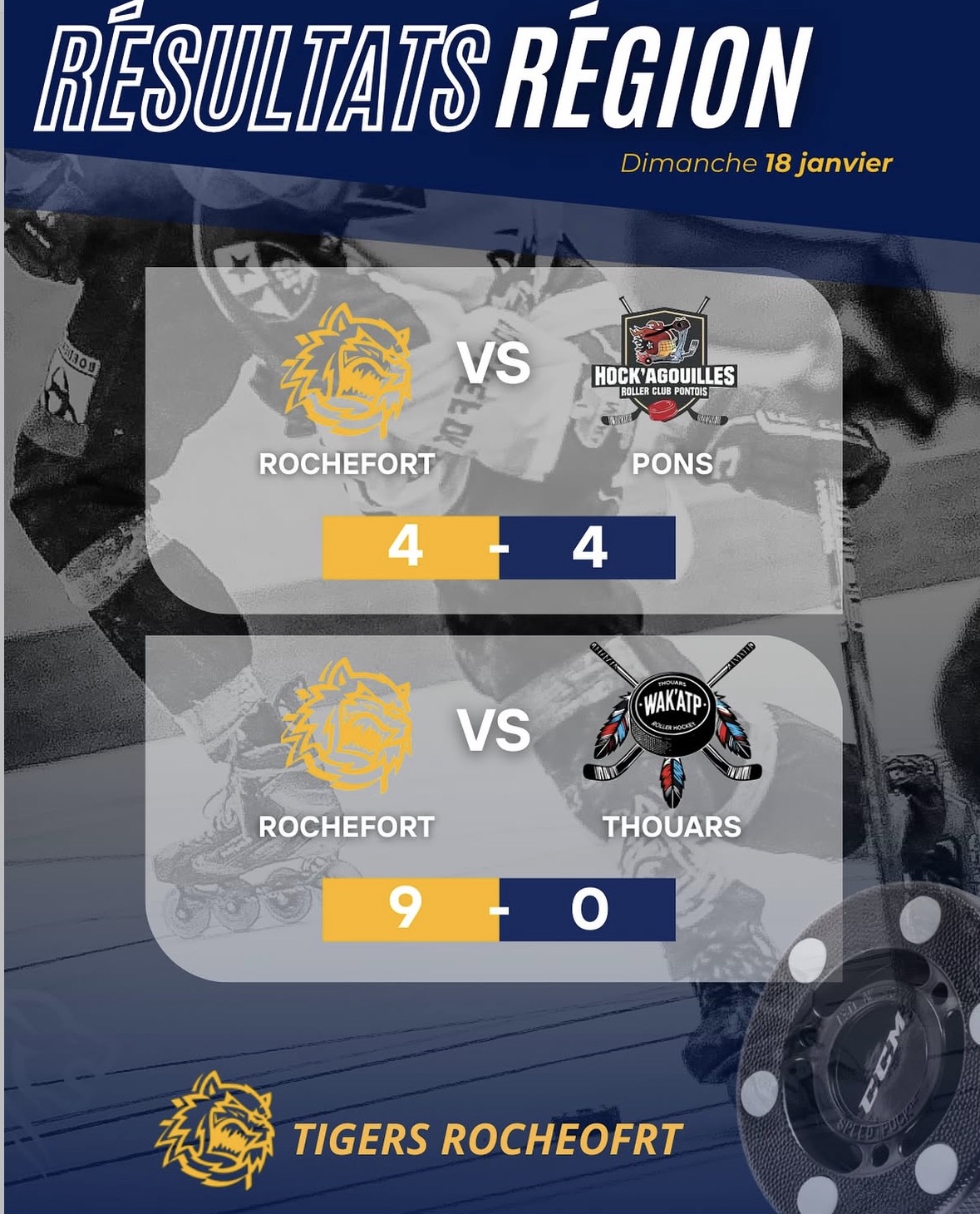 Journée contrastée mais globalement positive pour les Tigers ce 18 janvier ! Face aux Hock’agouilles de Pons, les Tigers ont livré un match intense qui s’est conclu sur un match nul 4 à 4. Une égalité frustrante, mais qui témoigne d’un duel équilibré entre deux belles équipes régionales.